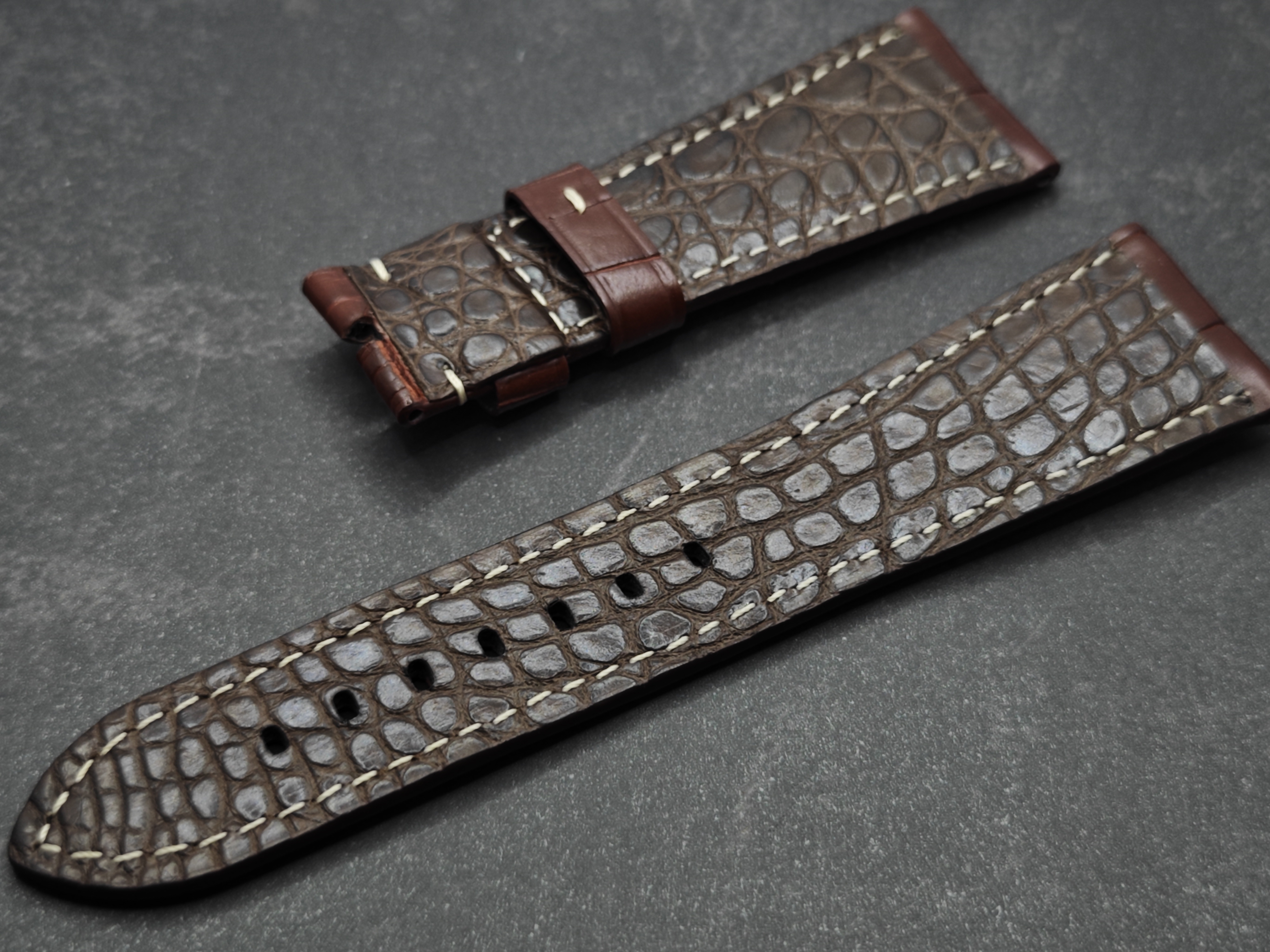 規格: 26mm x20mm 長度:125x75mm 厚度: 5.5mm x 2.7mm 漸變 皮料來源:進口100%美州大鱷魚皮 腹部大竹節紋 :最時興紋路 斯文中性 *超大塊竹節 2米大鱷魚的腹部 面料; A級美州大鱷魚 大竹紋 料 *非市場的B級C級鱷魚皮可比* 底料: 側腹部圓紋 車工手工:大品牌錶帶全包邊 再車線 (耐用及不會爆開 品質一定保証) 歐美訂單的要求 高品質銷路的貨品 溫馨提示:每條錶帶的花紋及紋路 不可能100%一樣 因天然動物皮的特性, 但不會錯花的(即腹紋皮對腹紋皮 全條帶都是腹紋皮 做帶時同一時間做 同時剪栽)望貴客理解!多謝 ™️ https://leatherstrapconcept.store 支付可選: Pay me / 轉數快 / 支付寶香港 / 渣打 / 中銀 /恆生/ Visa / Master / Google pay / Apple pay 💯信心:大型拍賣網商店 多次交易評價好 信心保證 🎁產品:衹挑選質數佳的錶帶 不會賣粗劣貨 💓信賴:相片絕無花巧成份 相片已是實物相,絕無加工 💫誠意:見貨買貨 所有錶帶都有存現貨的 交貨快 絕無借口 💝感謝:多謝各錶友的支持及交流玩錶心得 無言感激! **因應 本產品相片,在各顧客的電子顯示屏 ,顯示出來 都會有不同的光喑及顏色 色差 所以最終實物為主 不便之處請見解**